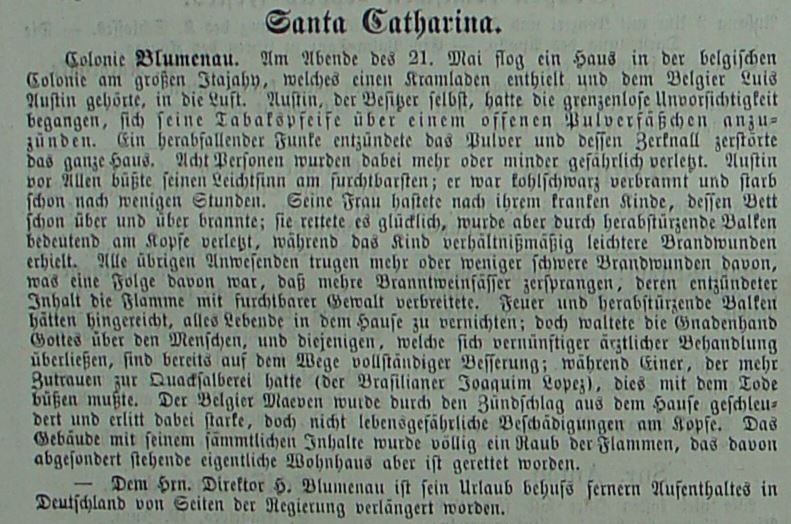 Na noite do dia 21 de maio (1867) uma casa explodiu na Colonia Belga do Itajaí grande, a qual abrigava um comércio pertencente ao belga Luis Austin. O próprio Austin, proprietário, iniciou essa enorme imprudência ao acender o seu cachimbo sobre uma barrica aberta de pólvora. Uma centelha inflamou a pólvora e sua explosão destruiu toda a casa. Oito pessoas ficaram mais ou menos gravemente feridas; Austin, entre todos estes, foi o que teve o pior destino; ele foi totalmente queimado e faleceu poucas horas após. A sua esposa correu para o seu filho (criança) doente, cuja cama já estava em chamas; ela conseguiu salvá-lo, mas foi ferida principalmente na cabeça por caibros que desabaram, enquanto a criança sofreu apenas queimaduras leves. Todos os demais presentes sofreram queimaduras mais ou menos graves, também devido às barricas de aguardente que se romperam com a explosão, tendo o líquido contribuído para o alastramento e aumento do poder das chamas. O fogo e o desabamento dos caibros já seriam suficientes para acabar com a vida de todos na casa; mas a mão piedosa de Deus esteve presente para proteger a vida das pessoas, e aqueles que aceitaram receber os devidos cuidados médicos estão se restabelecendo francamente; no entanto, um deles, que tinha mais confiança em curandeirismo (o brasileiro Joaquim Lopes), faleceu. O belga Maeben foi atirado para fora da casa e sofreu grande ferimento na cabeça, embora não sofra o risco de perder a vida. A construção, com todos os seus utensílios, foi totalmente destruída pelas chamas, mas a casa de morada anexa foi parcialmente poupada.