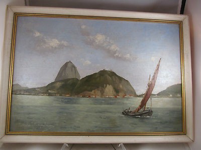 "This is a vintage and rare original signed oil painting done on plywood by Artist, sculptor and painter: Adrian Henri Van Emelen Vital (see short Biography below), dates from the 1930s, appears to be a fishing scene from the Port de Santos (Brazil) area with Mount Serrat (best guess as the painting is not titled) in the background; the painting shows some wear due to time (paint cracks due to plywood contraction, dirt), exposure and storage, but still in very acceptable condition, see pictures for better details. it measures 15" X 11" with the small frame." - text from Worthopedia.