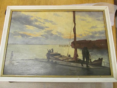 This is a vintage and rare original signed oil painting done on plywood by Artist, sculptor and painter: Adrian Henri Van Emelen Vital (see short Biography below), dates from the 1930s, appears to be a fishing scene from the Port de Santos (Brazil) area (best guess as the painting is not titled, but from online research he did a series of paintings in that area); the painting shows some normal wear due to time, exposure and storage, but still in very good condition, see pictures for better details. it measures 15" X 11" with the small frame.
