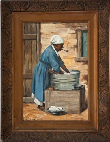 Mulher com cachimbo, turbante branco lavando roupa